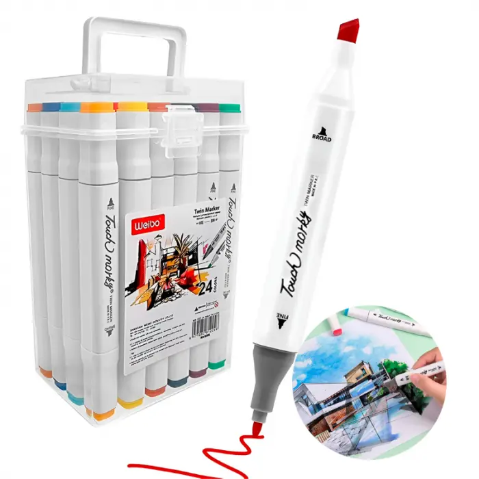 - El set incluye 24 marcadores + Estuche tipo valija con manija.